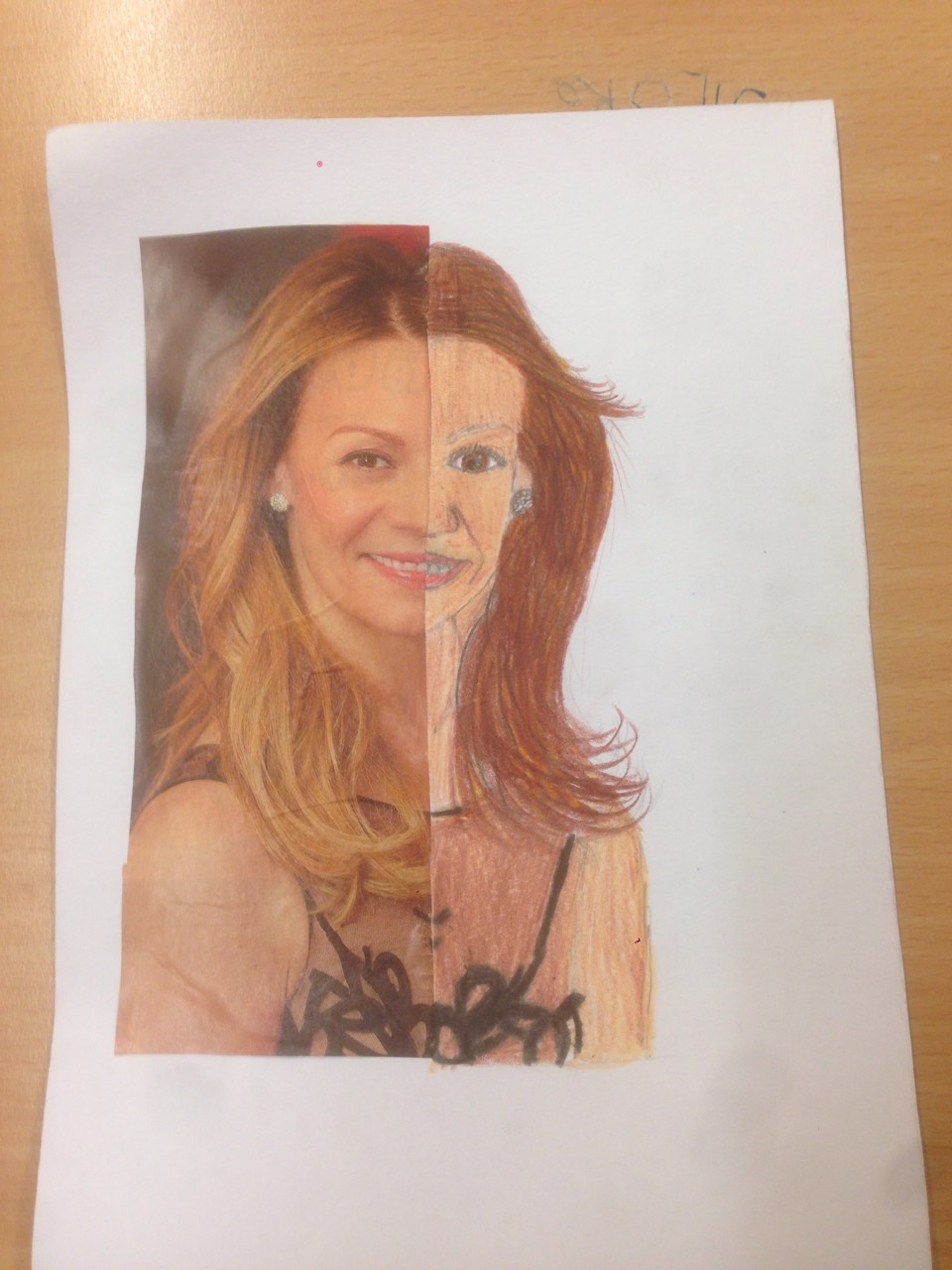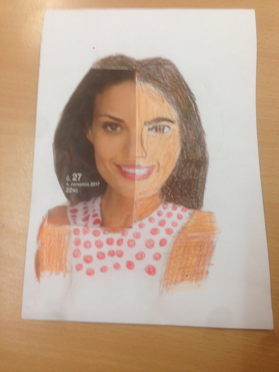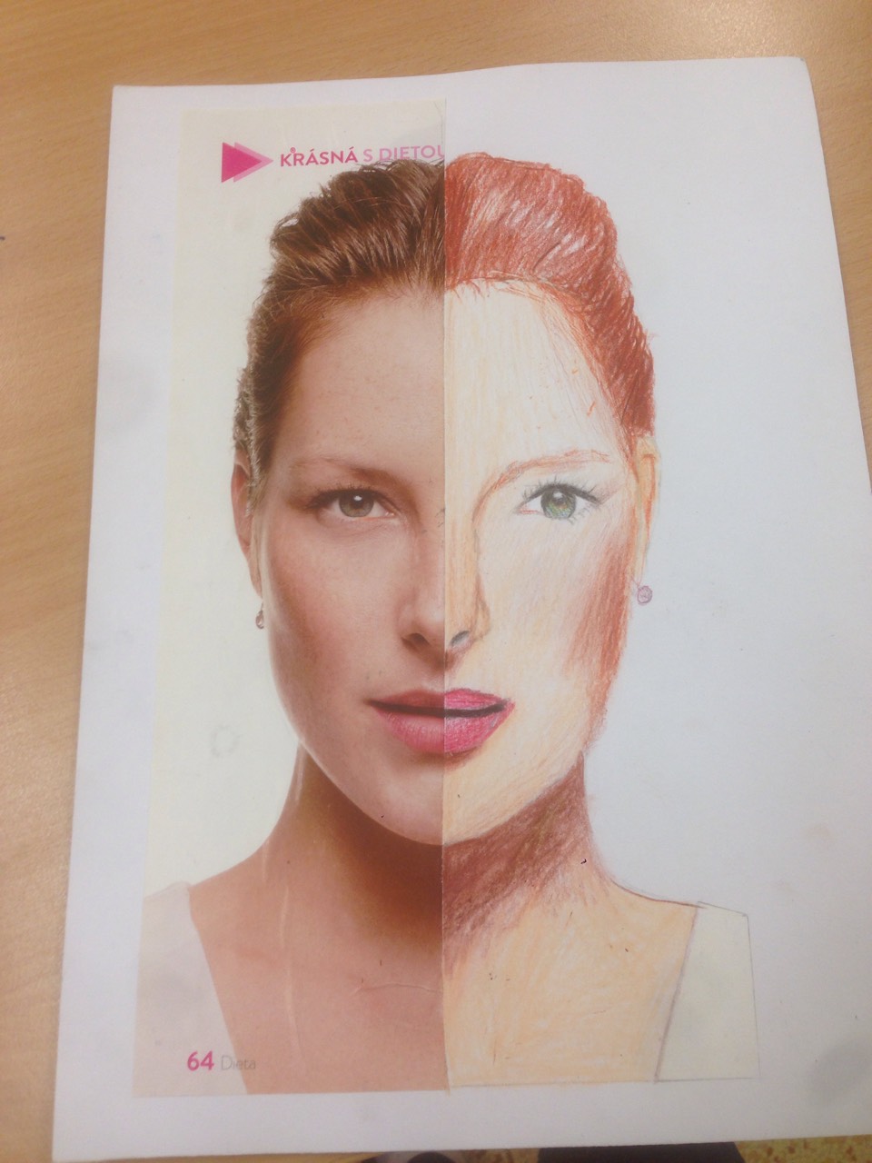 Úkolem bylo si donést polovinu obrázku obličeje člověka. Žáci si mohli donést obrázek z časopisů nebo vytisknout z PC. Pracovalo se pastelkami a úkolem bylo, aby výsledek byl co nejvíce podobný originálu. Všem se to moc povedlo, ale vybrala jsem tři práce, které mě nejvíce zaujaly. Na první obrázku mě zaujalo, že autorem byl chlapec Ondra a dokreslil obrázek s velkou pečlivostí. Druhý jsem zvolila proto, že dokreslenou ženou byla herečka Martina Randová (Heluš z Ordinace v Růžové zahradě), třetí obrázek jsem vybrala, protože na něm byl vidět ohromný cit pro přesnost. Obrázky zpracovaly Julie a Adéla ze 6. B.