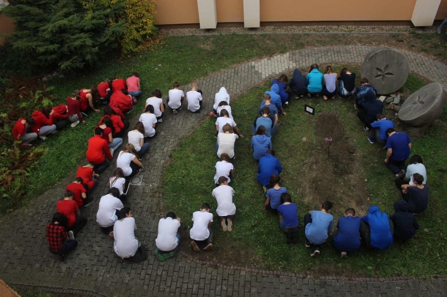 Vyvrcholením oslav se stal čtvrtek 25. října 2018. V átriu školy, které zdobí kamenné rozpůlené jablko - symbol vědění, vzdělanosti, se sešly třídy 7. B, 8. A a 9. B. Předtím prostor atria uklidili a vyzdobili, připravili na slavnostní akt. Žáci tříd se sešli v barvách, které najdete na naší vlajce. Celou slavností žáky provázely tři dívky, jabloň zasadili předsedové tříd, další žáci ji ozdobili trikolorou. Jablůňce jsme popřáli, aby se jí u nás ve škole dařilo. Na závěr zazněla státní hymna. Pak přišla na řadu barevná trička, ve kterých účastníci vytvořili ornament - stovku.